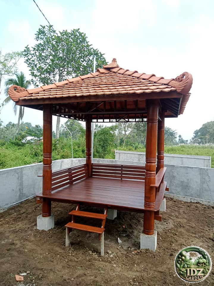 Gazebo ini dibuat menggunakan kayu kelapa atau glugu, yang dikenal memiliki karakteristik kuat, unik, dan ekonomis. Kayu kelapa memiliki serat khas yang memberikan tampilan natural dan berbeda dibanding kayu lainnya.